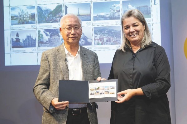 列支敦士登邮政集邮部负责人克里斯汀将《疫情300天》小版张邮票交与邓予立先生